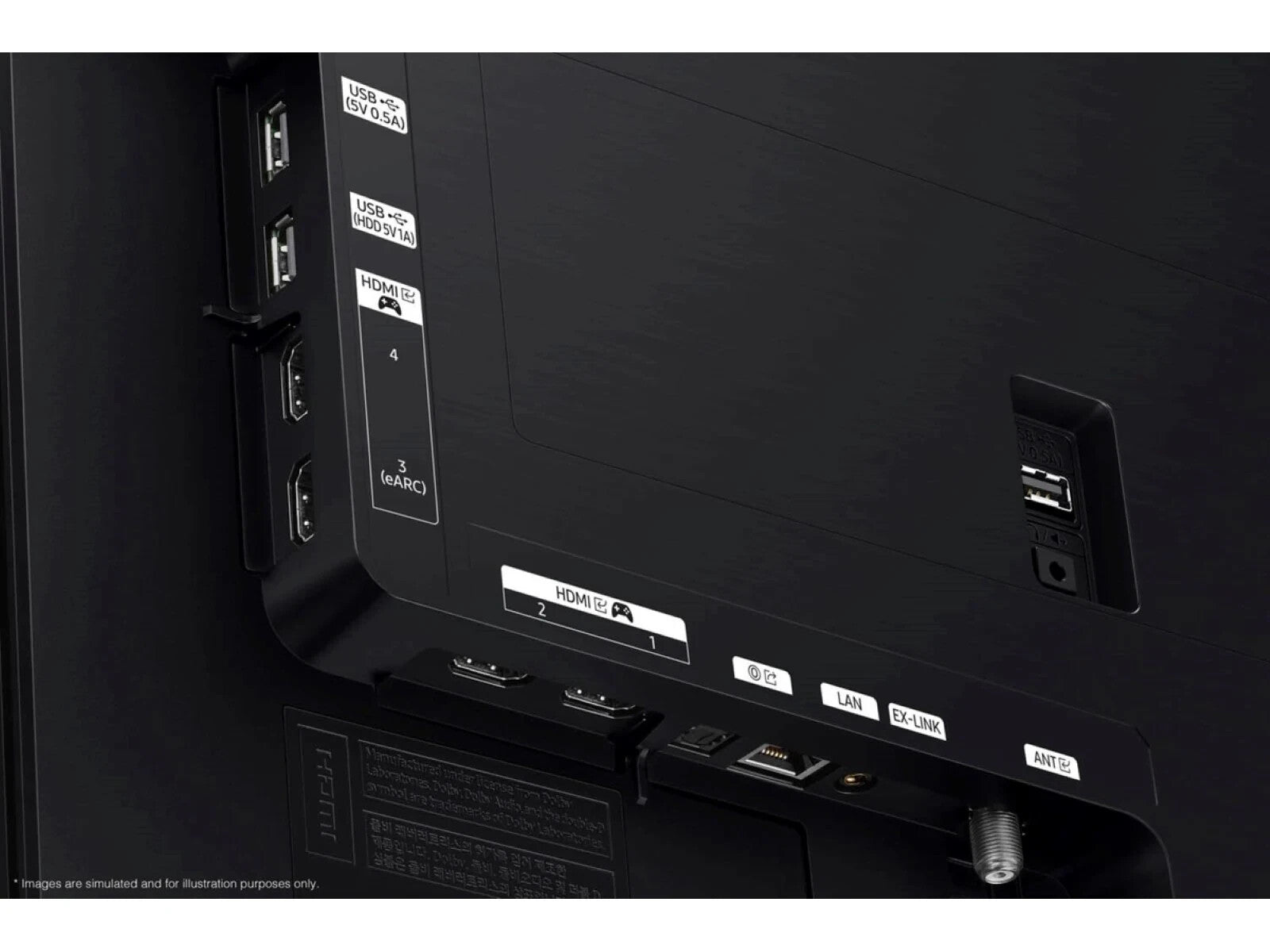 Wi-Fi is built-in for access to streaming and screen mirroring powered by Samsung's One UI Tizen OS. Four HDMI inputs are available to connect your video, audio, and gaming devices with advanced features, such as VRR and ALLM supported. Additionally, a built-in 40-watt, 2.1-channel speaker system provides full-range sound with object tracking, or you can connect to an external sound system via optical or eARC connections.